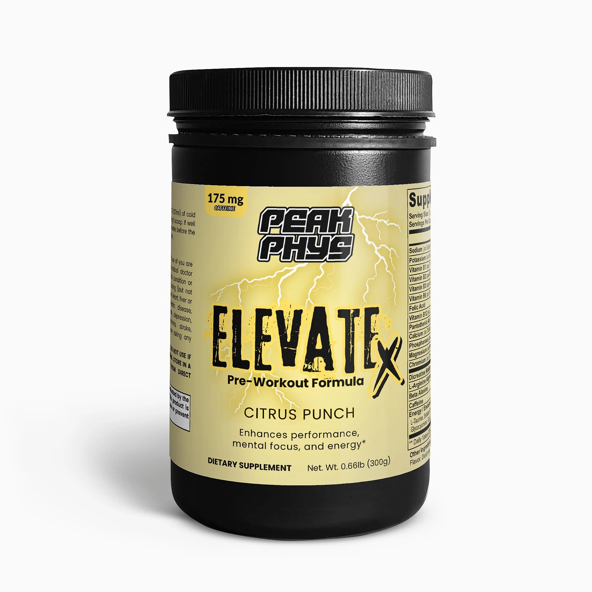 Power your workouts with Elevate X by Peak Physique Nutraceuticals, the ultimate pre-workout designed to take performance to the next level. Packed with caffeine for clean energy, a B-vitamin complex for vitality, and arginine AKG for explosive pumps, Elevate X helps you dominate every session. Beta-alanine supports ATP production, while creatine pre-cursors and dicreatine malate promote lean muscle and strength gains—even for non-responders. Taurine and L-tyrosine enhance mental focus and stamina, and 290 mg of electrolytes keep you performing at peak endurance. Elevate your energy, focus, and results—every rep, every set, every workout.